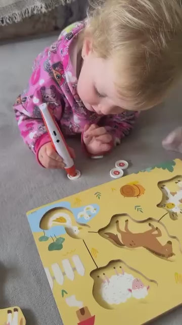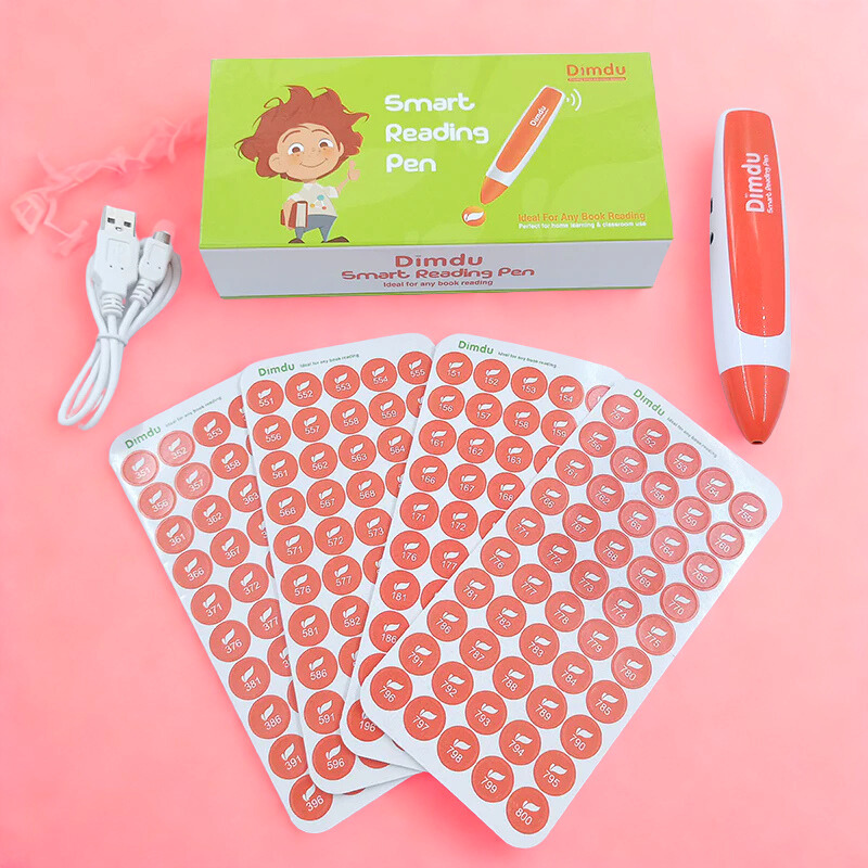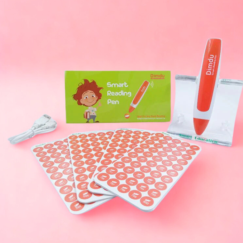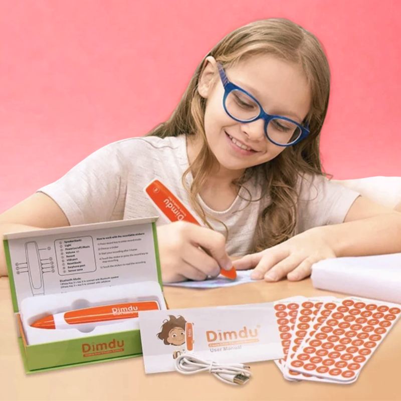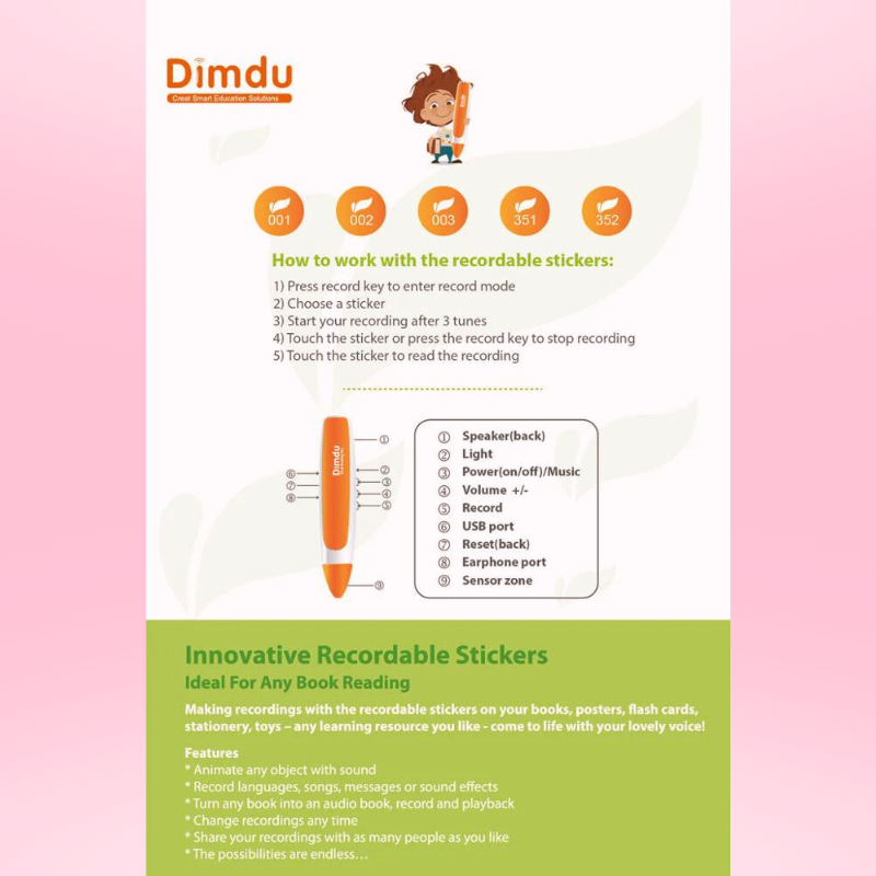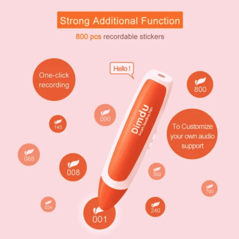 The Dimdu Smart Pen is an interactive educational tool designed to enhance learning by using reusable audio stickers. Simply attach a sticker to any book, flashcard, or object, record your voice, and tap the sticker with the pen to play it back.